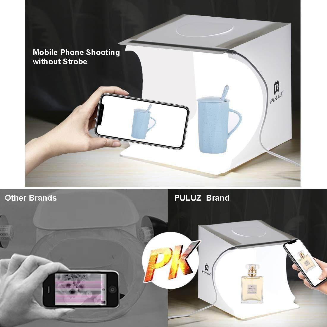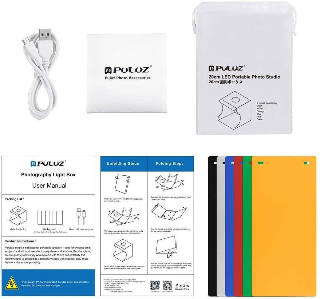 Mini Photo Studio Box, PULUZ 20cm 2 LED Light Portable Photography Shooting Tent Kit, White Folding Lighting Softbox with 20 LED Lights + 6 Backdrops for Product Display
