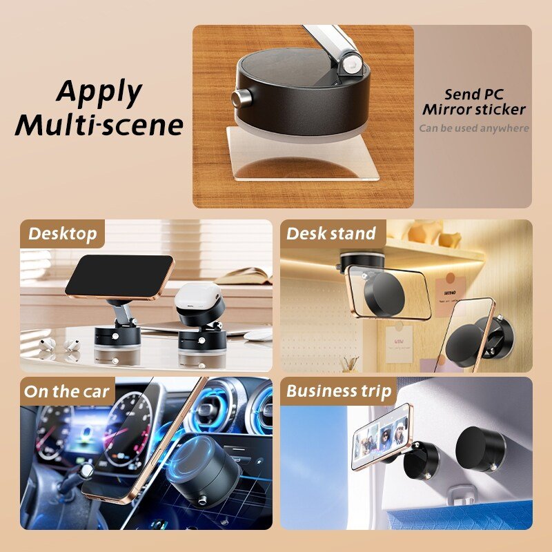 【Mobile Phone Suction Cup Holder Foldable]】Both sides of the Magnetic Suction Phone Mount can be used. The Vacum Side compatible with objects with smooth surfaces, such as car screens,glass, mirrors, metal,smooth tiles,marble and smooth and flat stainless steel surfaces. Also supporting multi-angle adjustments, the Suction Cup Magnetic Phone Mount's retractable structure offers versatile viewing angles for optimal phone operation